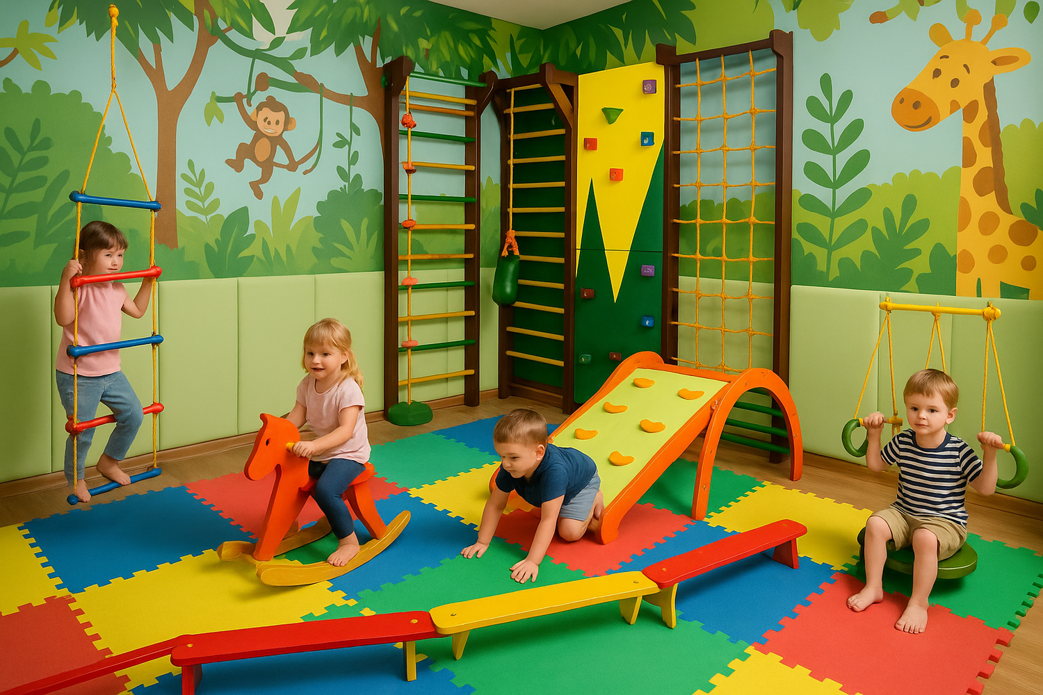 Strengthens Muscles: Activities like climbing, swinging, and balancing help develop both upper and lower body strength.
